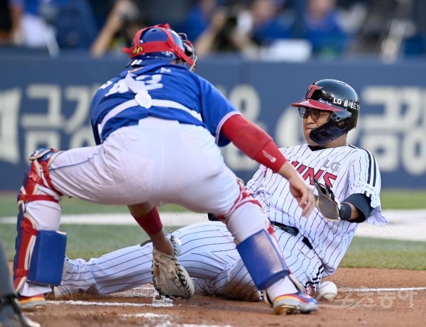 16일 서울 잠실야구장에서 ‘2022 신한은행 MY CAR KBO리그’ 삼성 라이온즈와 LG 트윈스 경기가 열렸다. 1회말 1사 2루 LG 안타 때 2루주자 채은성이 홈까지 달려 세이프 되고 있다.