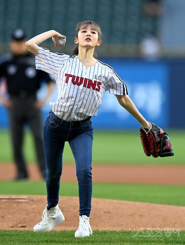 16일 서울 잠실야구장에서 ‘2022 신한은행 MY CAR KBO리그’ 삼성 라이온즈와 LG 트윈스 경기가 열렸다. 경기 전 걸그룹 스테이씨 시은이 시구를 하고 있다.
