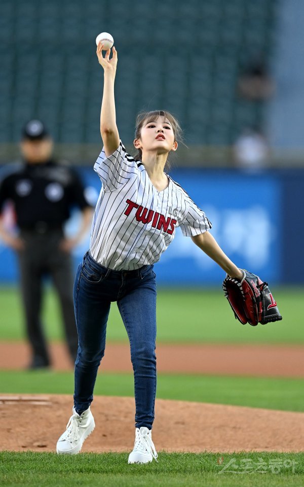 16일 서울 잠실야구장에서 ‘2022 신한은행 MY CAR KBO리그’ 삼성 라이온즈와 LG 트윈스 경기가 열렸다. 경기 전 걸그룹 스테이씨 시은이 시구를 하고 있다.