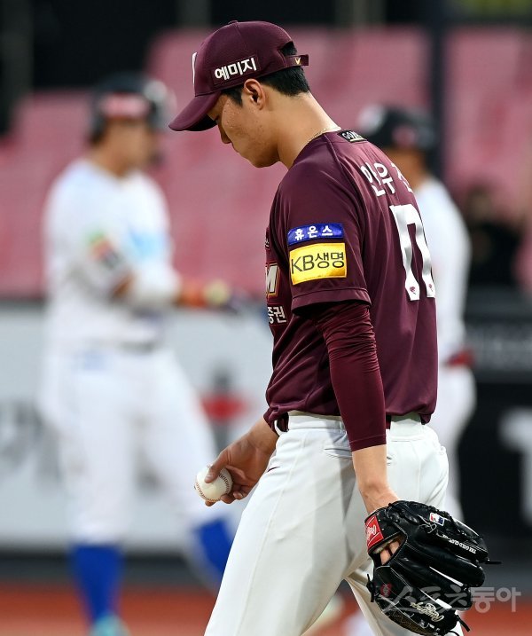 16일 경기도 수원 kt위즈파크에서 ‘2022 신한은행 SOL KBO리그’ kt 위즈와 키움 히어로즈의 경기가 열렸다. 3회말 1사 1, 2루에서 적시타를 허용한 키움 선발 안우진이 아쉬워하고 있다.
