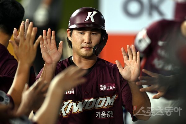 16일 경기도 수원 kt위즈파크에서 ‘2022 신한은행 SOL KBO리그’ kt 위즈와 키움 히어로즈의 경기가 열렸다. 5회초 1사 1, 3루에서 적시타 때 키움 임지열이 득점을 올린 후 동료들의 환영을 받고 있다.