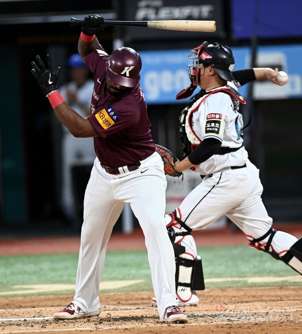 16일 경기도 수원 kt위즈파크에서 ‘2022 신한은행 SOL KBO리그’ kt 위즈와 키움 히어로즈의 경기가 열렸다. 4회초 1사에서 키움 푸이그가 삼진 아웃으로 물러나며 아쉬워하고 있다.