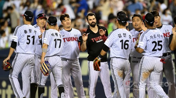 16일 서울 잠실야구장에서 ‘2022 신한은행 MY CAR KBO리그’ 삼성 라이온즈와 LG 트윈스 경기가 열렸다. 6-3 승리를 거둔 LG 선수들이 하이파이브 하고 있다.