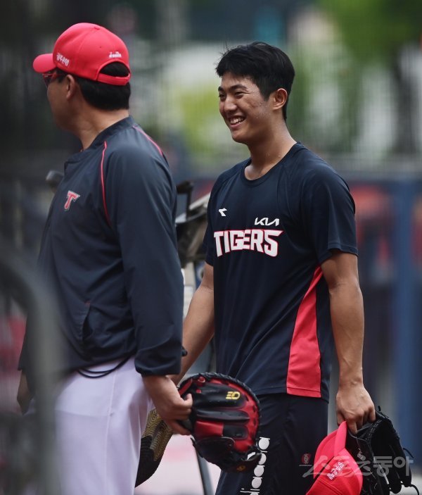 17일 광주기아챔피언스필드에서 열린 ‘2022 신한은행 SOL KBO리그’ KIA 타이거즈와 SSG 랜더스의 경기에 앞서 훈련을 마친 KIA 이의리가 웃고 있다.
