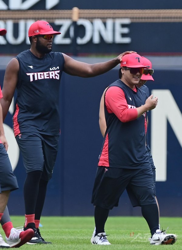 17일 광주기아챔피언스필드에서 열린 ‘2022 신한은행 SOL KBO리그’ KIA 타이거즈와 SSG 랜더스의 경기에 앞서 KIA 소크라테스가 김선빈에게 장난을 치고 있다.