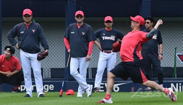 17일 광주기아챔피언스필드에서 열린 ‘2022 신한은행 SOL KBO리그’ KIA 타이거즈와 SSG 랜더스의 경기에 앞서 KIA 놀린이 외야에서 캐치볼을 하고 있다.