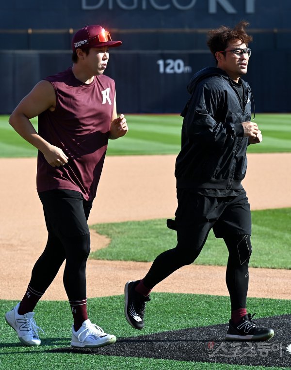 17일 경기도 수원 kt위즈파크에서 ‘2022 신한은행 SOL KBO리그’ kt 위즈와 키움 히어로즈의 경기가 열린다. 경기 전 키움 김재현, 이지영이 스트레칭 훈련을 하고 있다.