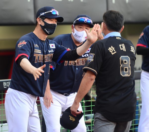 17일 광주기아챔피언스필드에서 열린 ‘2022 신한은행 SOL KBO리그’ KIA 타이거즈와 SSG 랜더스의 경기에 앞서 레전드 40인에 선정된 한대화 전 감독이 KIA 김종국 감독과 하이파이브를 하고 있다.