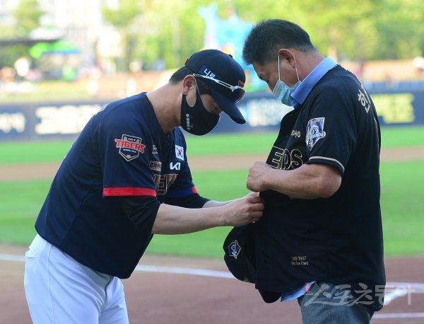 17일 광주기아챔피언스필드에서 열린 ‘2022 신한은행 SOL KBO리그’ KIA 타이거즈와 SSG 랜더스의 경기에 앞서 레전드 40인에 선정된 한대화 전 감독이 KIA 김종국 감독으로부터 기념 유니폼을 받아 입고 있다.