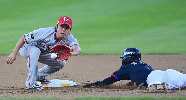 17일 광주기아챔피언스필드에서 열린 ‘2022 신한은행 SOL KBO리그’ KIA 타이거즈와 SSG 랜더스의 경기에서 1회말 무사 1루 상황에서 SSG 김성현이 1루주자에게 도루를 허용하고 있다.