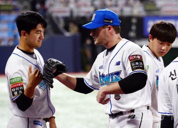 17일 경기도 수원 kt위즈파크에서 ‘2022 신한은행 SOL KBO리그’ kt 위즈와 키움 히어로즈의 경기가 열렸다. 7회까지 키움 공격을 1실점으로 막은 kt 선발 벤자민이 이닝 종료 후 동료들의 환영을 받고 있다.