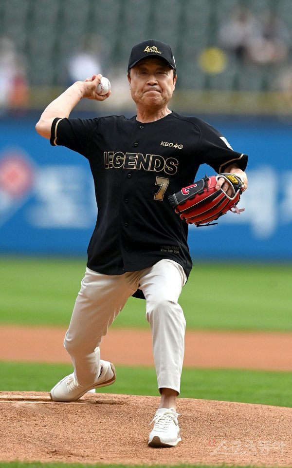 17일 서울 잠실야구장에서 ‘2022 신한은행 MY CAR KBO리그’ 삼성 라이온즈와 LG 트윈스 경기가 열렸다. 경기 전 KBO 레전드 40인 김재박 전 감독이 시구를 하고 있다.