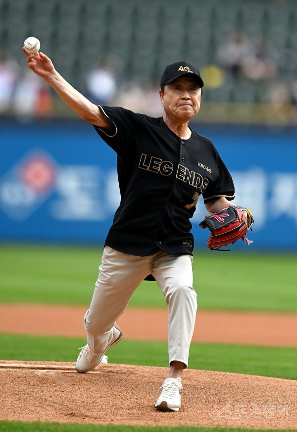 17일 서울 잠실야구장에서 ‘2022 신한은행 MY CAR KBO리그’ 삼성 라이온즈와 LG 트윈스 경기가 열렸다. 경기 전 KBO 레전드 40인 김재박 전 감독이 시구를 하고 있다.
