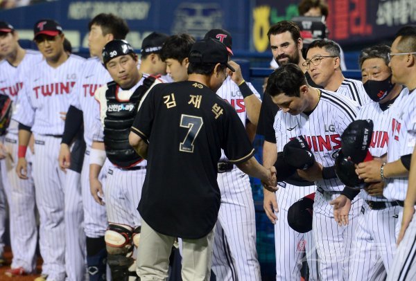 17일 서울 잠실야구장에서 ‘2022 신한은행 MY CAR KBO리그’ 삼성 라이온즈와 LG 트윈스 경기가 열렸다. 클리닝타임 때 김재박 전 감독이 KBO 레전드 40인 시상식을 마치고 LG 선수들과 악수를 하고 있다.