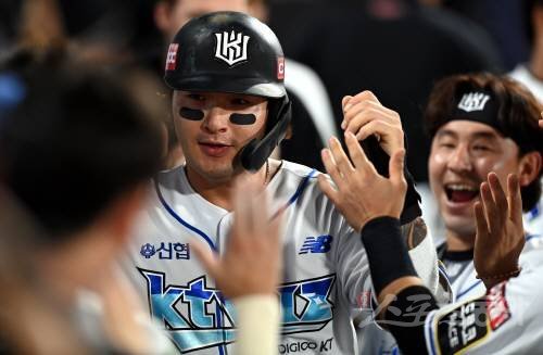 17일 경기도 수원 kt위즈파크에서 ‘2022 신한은행 SOL KBO리그’ kt 위즈와 키움 히어로즈의 경기가 열렸다. 8회말 2사 1, 2루에서 안타 때 kt 박병호가 득점을 올린 후 동료들의 환영을 받고 있다.