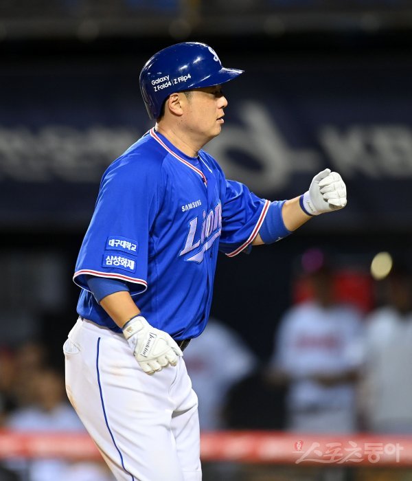 17일 서울 잠실야구장에서 ‘2022 신한은행 MY CAR KBO리그’ 삼성 라이온즈와 LG 트윈스 경기가 열렸다. 7회초 무사 삼성 이원석이 좌월 솔로 홈런을 날리고 그라운드를 돌아 홈인해 하이파이브 하고 있다.