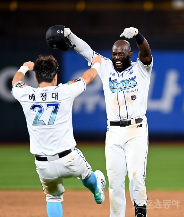17일 경기도 수원 kt위즈파크에서 ‘2022 신한은행 SOL KBO리그’ kt 위즈와 키움 히어로즈의 경기가 열렸다. 9회말 1사 1루에서 kt 알포드가 끝내기 1타점 2루타를 날린 후 동료들과 기쁨을 나누고 있다.