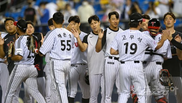 17일 서울 잠실야구장에서 ‘2022 신한은행 MY CAR KBO리그‘ 삼성 라이온즈와 LG 트윈스 경기가 열렸다. 11-7 승리를 거두며 2연승을 달린 LG 선수들이 하이파이브 하고 있다. 잠실 | 김종원 기자 won@donga.com