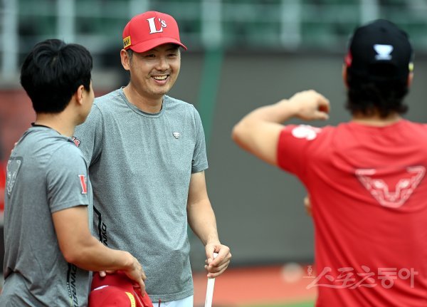 18일 인천 SSG 랜더스필드에서 ‘2022 신한은행 SOL KBO리그’ SSG 랜더스와 LG 트윈스의 경기가 열린다. 경기 전 SSG 김원형 감독이 선수들과 이야기를 나누고 있다.