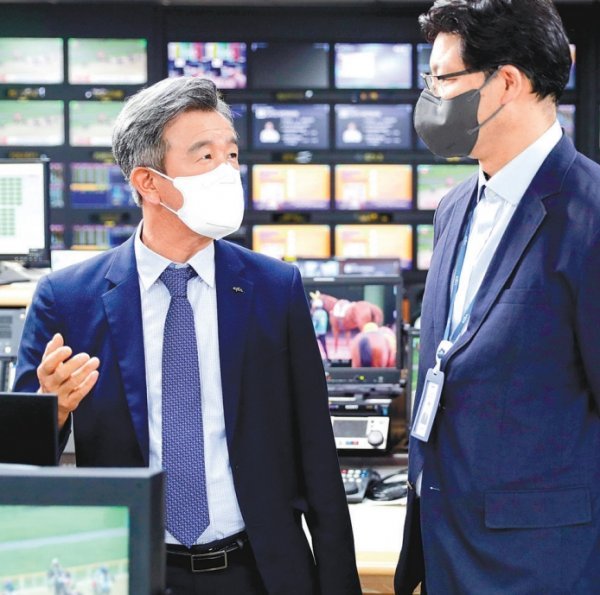 한국마사회 국제방송센터 점검 중인 정기환 한국마사회장(왼쪽). 한국마사회는 올해 코리아컵을 지난 대회보다 두 배 가까이 늘어난 세계 17개국으로 수출할 계획이다. 사진제공|한국마사회