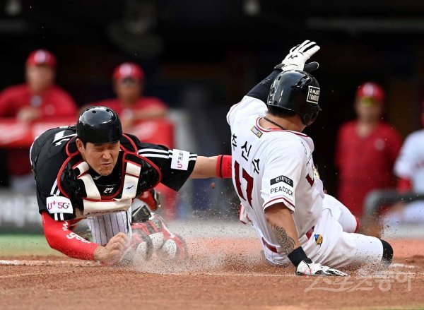 18일 인천 SSG 랜더스필드에서 ‘2022 신한은행 SOL KBO리그’ SSG 랜더스와 LG 트윈스의 경기가 열렸다. 1회말 무사 1, 3루에서 내야땅볼 때 LG 유강남이 홈으로 파고들던 SSG 추신수를 태그 아웃시키고 있다.