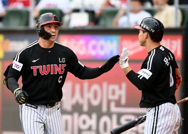 18일 인천 SSG 랜더스필드에서 ‘2022 신한은행 SOL KBO리그’ SSG 랜더스와 LG 트윈스의 경기가 열렸다. 1회초 2사 2루에서 LG 오지환이 투런 홈런을 쏘아 올린 후 동료의 환영을 받고 있다.