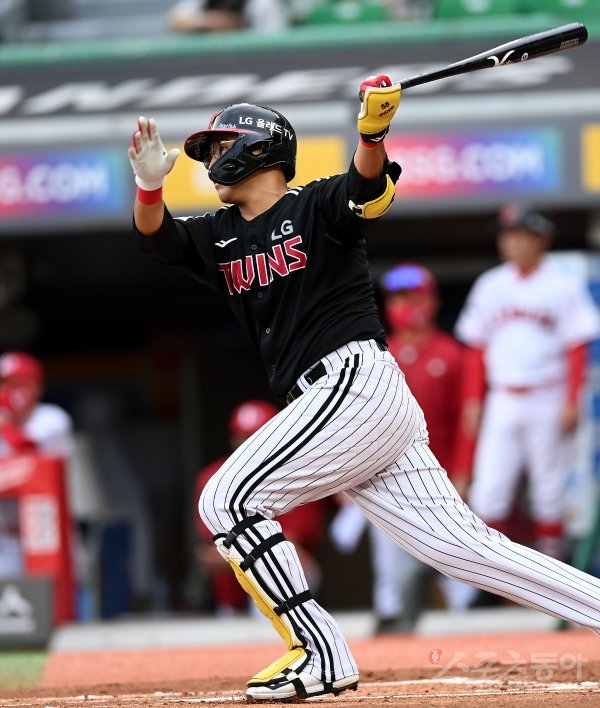 18일 인천 SSG 랜더스필드에서 ‘2022 신한은행 SOL KBO리그’ SSG 랜더스와 LG 트윈스의 경기가 열렸다. 1회초 2사 2루에서 LG 채은성이 1타점 2루타를 날리고 있다.