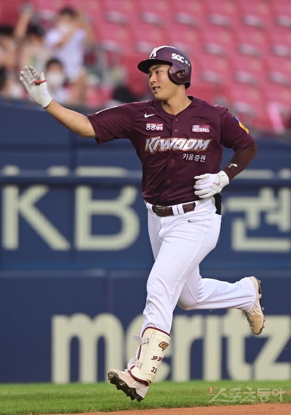 18일 서울 잠실야구장에서 열린 ‘2022 신한은행 SOL KBO리그’ 두산 베어스와 키움 히어로즈의 경기에서 2회초 1사 키움 김휘집이 좌월 선제 솔로 홈런을 친 후 세리머니를 하고 있다.