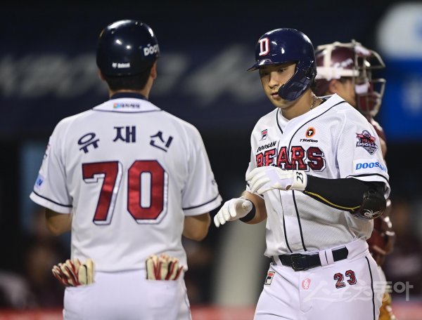 18일 서울 잠실야구장에서 열린 ‘2022 신한은행 SOL KBO리그’ 두산 베어스와 키움 히어로즈의 경기에서 5회말 1사 두산 강승호가 역전 좌월 솔로 홈런을 친 후 1루코치와 기쁨을 나누고 있다.