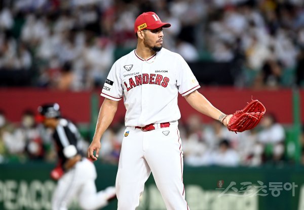 18일 인천 SSG 랜더스필드에서 ‘2022 신한은행 SOL KBO리그’ SSG 랜더스와 LG 트윈스의 경기가 열렸다. 6회초 무사에서 SSG 선발 폰트가 홈런을 허용한 후 아쉬워하고 있다.