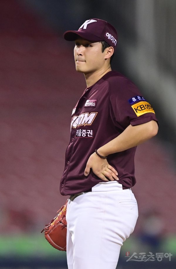 18일 서울 잠실야구장에서 열린 ‘2022 신한은행 SOL KBO리그’ 두산 베어스와 키움 히어로즈의 경기에서 7회말 1사 1, 2루 두산에 실점한 키움 최원태가 아쉬워하고 있다.