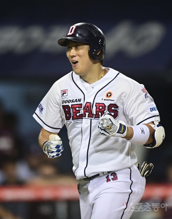 18일 서울 잠실야구장에서 열린 ‘2022 신한은행 SOL KBO리그’ 두산 베어스와 키움 히어로즈의 경기에서 7회말 2사 2루 두산 허경민이 좌월 2점 홈런을 친 후 세리머니를 하고 있다.