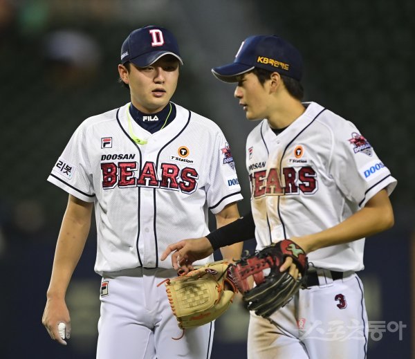 18일 서울 잠실야구장에서 열린 ‘2022 신한은행 SOL KBO리그’ 두산 베어스와 키움 히어로즈의 경기에서 7회초 수비를 마친 두산 정철원이 동료와 이야기를 하고 있다.
