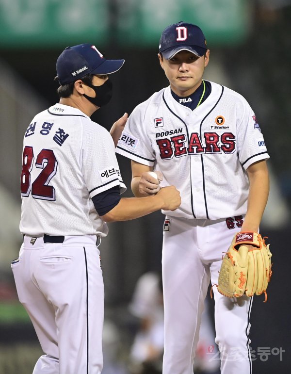 18일 서울 잠실야구장에서 열린 ‘2022 신한은행 SOL KBO리그’ 두산 베어스와 키움 히어로즈의 경기에서 8회초 2사 1루 상황에서 두산 정철원이 마운드를 내려오며 권명철 코치와 기쁨을 나누고 있다.