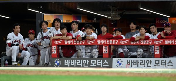 18일 인천 SSG 랜더스필드에서 ‘2022 신한은행 SOL KBO리그’ SSG 랜더스와 LG 트윈스의 경기가 열렸다. 4-8로 뒤진 SSG의 9회말 마지막 공격 때 선수들이 경기를 지켜보고 있다.