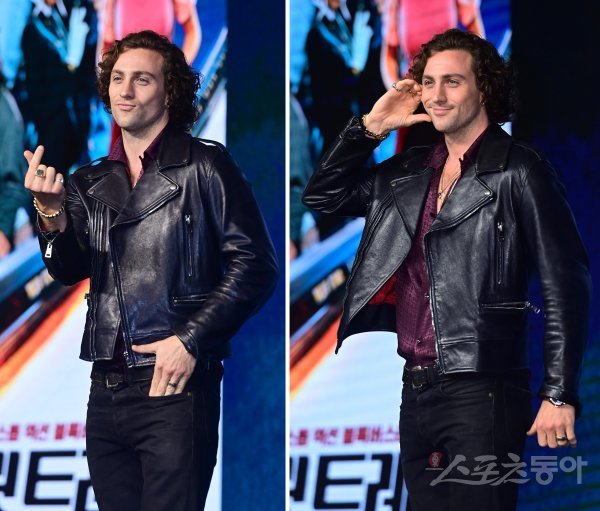 배우 애런 테일로 존슨이 19일 서울 영등포구 여의도동 콘래드 서울에서 열린 영화 ‘불릿 트레인’ 기자간담회에서 포즈를 취하고 있다.