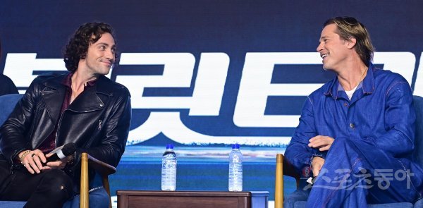 배우 애런 테일러 존슨과 브래드 피트가 19일 서울 영등포구 여의도동 콘래드 서울에서 열린 영화 ‘불릿 트레인’ 기자간담회에서 답변을 마친 후 서로를 바라보고 있다.