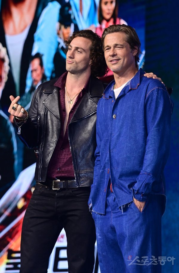 배우 애런 테일러 존슨과 브래드 피트가 19일 서울 영등포구 여의도동 콘래드 서울에서 열린 영화 ‘불릿 트레인’ 기자간담회에서 포즈를 취하고 있다.