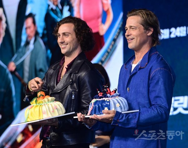 배우 애런 테일러 존슨과 브래드 피트가 19일 서울 영등포구 여의도동 콘래드 서울에서 열린 영화 ‘불릿 트레인’ 기자간담회에서 복주머니 모양 케이크를 받고 포즈를 취하고 있다.