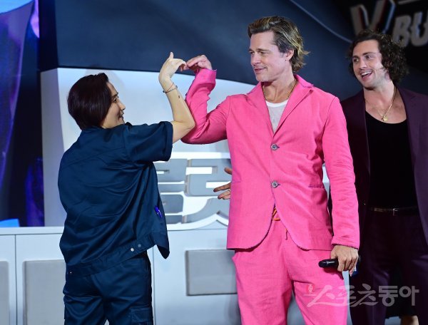 박경림과 브래드 피트가 19일 서울 용산구 CGV용산아이파크몰점에서 열린 영화 ‘불릿 트레인’ 레드카펫 무대에서 포즈를 취하고 있다.