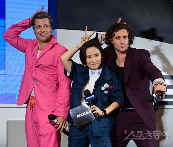 브래드 피트, 박경림, 애런 테일러 존슨이 19일 서울 용산구 CGV용산아이파크몰점에서 열린 영화 ‘불릿 트레인’ 레드카펫 무대에서 포즈를 취하고 있다.