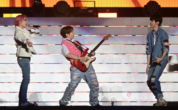 레이든, 샤오쥔, 성찬이 20일 경기도 수원월드컵경기장에서 열린 ‘SMTOWN LIVE 2022 : SMCU EXPRESS @HUMAN CITY_SUWON(SM타운 라이브)’에서 공연을 펼치고 있다.