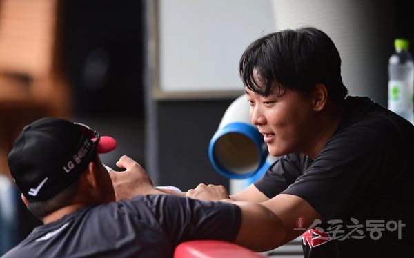 21일 서울 잠실야구장에서 열린 ‘2022 신한은행 SOL KBO리그’ LG 트윈스와 두산 베어스의 경기에 앞서 LG 이재원이 코치와 이야기를 하고 있다.
