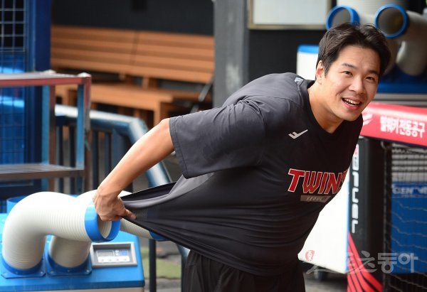 21일 서울 잠실야구장에서 열린 ‘2022 신한은행 SOL KBO리그’ LG 트윈스와 두산 베어스의 경기에 앞서 LG 김대유가 훈련을 마친 후 에어컨 바람을 쐬고 있다.