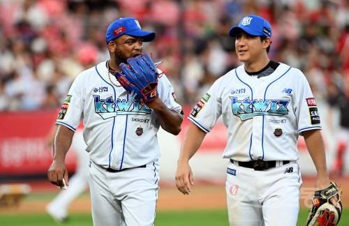 21일 경기도 수원 kt위즈파크에서 ‘2022 신한은행 SOL KBO리그’ kt 위즈와 KIA 타이거즈의 경기가 열렸다. kt 선발투수 데스파이네가 5회까지 KIA 공격을 1실점으로 막은 후 황재균과 이야기를 나누고 있다.