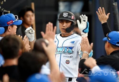 21일 경기도 수원 kt위즈파크에서 ‘2022 신한은행 SOL KBO리그’ kt 위즈와 KIA 타이거즈의 경기가 열렸다. 5회말 1사 1, 3루에서 kt 황재균이 3점 홈런을 쏘아 올린 후 동료들의 환영을 받고 있다.