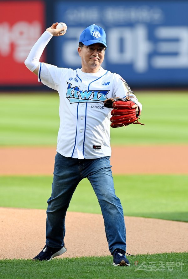 21일 경기도 수원 kt위즈파크에서 ‘2022 신한은행 SOL KBO리그’ kt 위즈와 KIA 타이거즈의 경기가 열렸다. 경기 전 김동연 경기도지사가 시구를 던지고 있다.