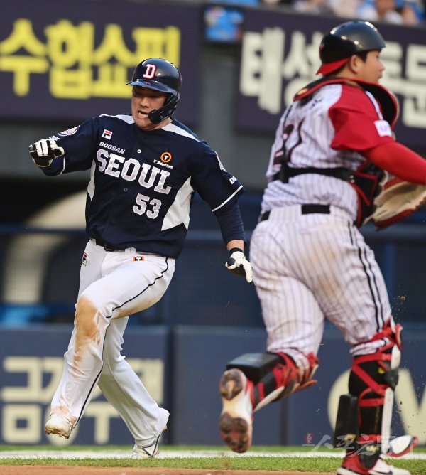 21일 서울 잠실야구장에서 열린 ‘2022 신한은행 SOL KBO리그’ LG 트윈스와 두산 베어스의 경기에서 6회초 무사 2루 두산의 중전 안타 때 2루주자 양석환이 홈으로 달리고 있다.