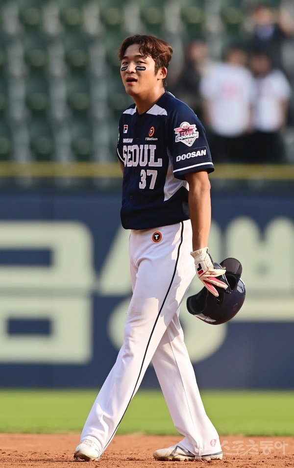 21일 서울 잠실야구장에서 열린 ‘2022 신한은행 SOL KBO리그’ LG 트윈스와 두산 베어스의 경기에서 2회초 1사 1루 두산의 뜬공 타구 때 두산 김대한이 귀루 실패로 아웃당한 후 아쉬워하고 있다.