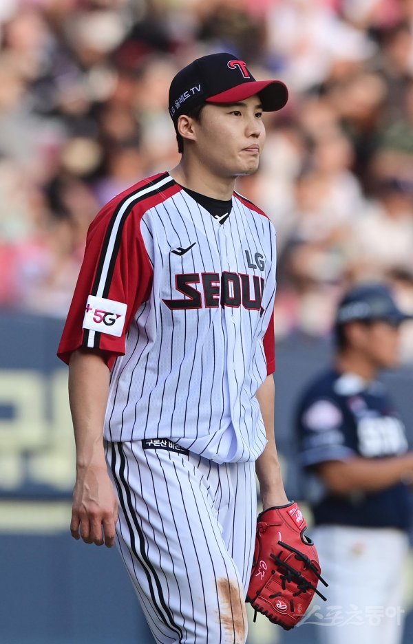 21일 서울 잠실야구장에서 열린 ‘2022 신한은행 SOL KBO리그’ LG 트윈스와 두산 베어스의 경기에서 4회초 2사 1루 상황에서 LG 임찬규가 견제 송구 실책을 저지른 후 아쉬워하고 있다.